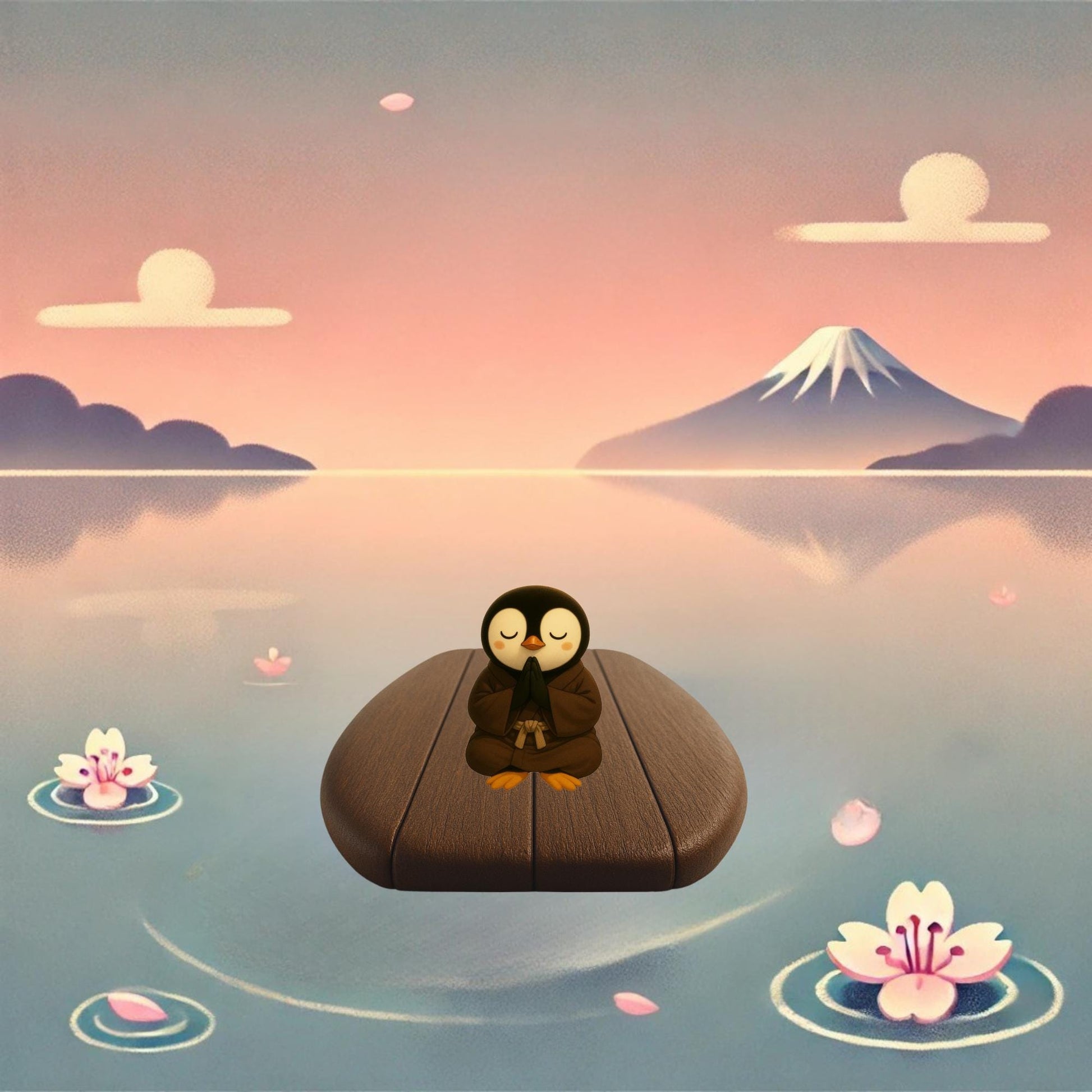 Adrift upon an old wooden board, a thoughtful little penguin follows the wind and the whispers of the sea. Guided by moonlight, ancestors, and the poetry in the air, he drifts toward Japan,a land where stillness, beauty, and gratitude live in every breath.